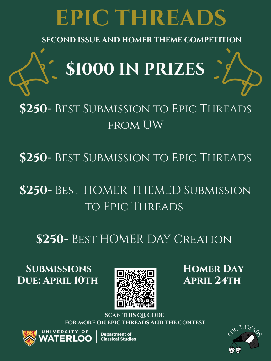 For contest eligibility, Epic Thread submissions must be received by April 10, 2026. The prize winners will be announced at our Homer Day event on Friday April 24th. Epic Threads is thankful to the Classics Department and the Shalom Trust at the University of Waterloo for funding the following awards: